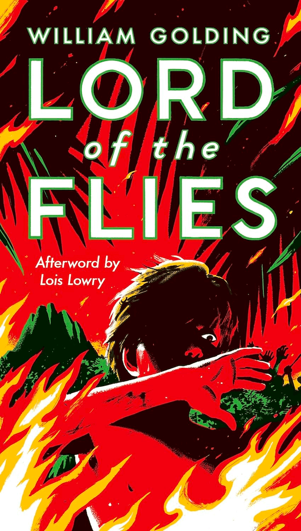 Why this cover works: This cover for the mass-market paperback of Lord of the Flies has a vintage feel to it that fits the subject and setting. The red, green, and yellow color palette is striking, especially with the black and white highlights. Outlining the typography in green is a nice touch that enhances readability.