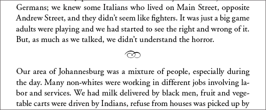 But the text break is also a fun opportunity for you as a book designer to add something to the page, or choose to stay back quietly while the author tells her story.